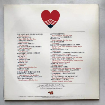 Sgt. Pepper's Lonely Hearts Club Band / With A Little Help From My Friends 4:42 A1a The Bee Gees* / Paul Nicholas– Sgt. Pepper's Lonely Hearts Club Band A1b Peter Frampton / The Bee Gees*– With A Little Help From My Friends A2 Sandy Farina– Here Comes The Sun 3:05 A3 Peter Frampton / The Bee Gees*– Getting Better 2:46 A4 Dianne Steinberg / Stargard– Lucy In The Sky With Diamonds 3:41 A5 The Bee Gees* / Dianne Steinberg / Paul Nicholas / Donald Pleasence / Stargard– I Wan't You (She's So Heavy) 6:31 B1 Paul Nicholas / Peter Frampton / The Bee Gees*– Good Morning, Good Morning 1:58 B2 The Bee Gees* / Jay MacIntosh / John Wheeler (4)– She's Leaving Home 2:40 B3 Paul Nicholas / Dianne Steinberg– You Never Give Me Your Money 3:07 B4 Robin Gibb– Oh! Darling 3:29 B5 Steve Martin (2)– Maxwell's Silver Hammer 4:00 Polythene Pam / She Came In Through The Bathroom Window / Nowhere Man / Sgt. Pepper's Lonely Hearts Club Band (Reprise) 5:11 B6a The Bee Gees*– Polythene Pam B6b Peter Frampton / The Bee Gees*– She Came In Through The Bathroom Window B6c The Bee Gees*– Nowhere Man B6d Peter Frampton / The Bee Gees*– Sgt. Pepper's Lonely Hearts Club Band (Reprise) C1 Earth, Wind & Fire– Got To Get You Into My Life 3:36 C2 Sandy Farina– Strawberry Fields Forever 3:31 C3 Frankie Howerd / Sandy Farina– When I'm Sixty-Four 2:40 C4 Frankie Howerd– Mean Mr. Mustard 2:39 C5 George Burns– Fixing A Hole 2:25 C6 Alice Cooper (2) / The Bee Gees*– Because 2:45 Golden Slumbers / Carry That Weight 3:24 C7a Peter Frampton– Golden Slumbers C7b The Bee Gees*– Carry That Weight D1 Aerosmith– Come Together 3:46 D2 Maurice Gibb / Peter Frampton / George Burns / The Bee Gees*– Being For The Benefit Of Mr. Kite 3:12 D3 Peter Frampton– The Long And Winding Road 3:40 D4 Barry Gibb / The Bee Gees*– A Day In The Life 5:11 D5 Billy Preston– Get Back 2:56 D6 The Cast*– Sgt. Pepper's Lonely Hearts Club Band (Finale) 2:13