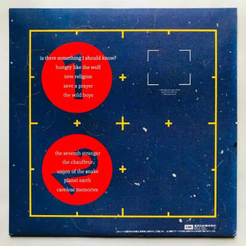 A1 Is There Something I Should Know? 4:37 A2 Hungry Like The Wolf 3:57 A3 New Religion 5:37 A4 Save A Prayer 6:09 A5 The Wild Boys 4:15 B1 The Seventh Stranger 5:10 B2 The Chauffeur 5:24 B3 Union Of The Snake 4:09 B4 Planet Earth 4:30 B5 Careless Memories 4:06